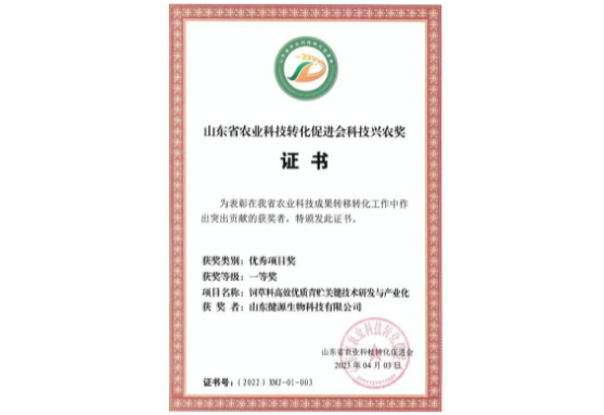 2023年5月27日, 第三屆全省科技興農(nóng)獎(jiǎng)表彰獎(jiǎng)勵(lì)大會在青島成功舉行,會上對在2022年度全省農(nóng)業(yè)科技成果轉(zhuǎn)化工作中涌現(xiàn)的先進(jìn)集體、先進(jìn)個(gè)人和優(yōu)秀項(xiàng)目進(jìn)行表彰,山東健源生物科技有限公司《飼草料高效優(yōu)質(zhì)青貯關(guān)鍵技術(shù)研發(fā)與產(chǎn)業(yè)化》項(xiàng)目榮獲山東省農(nóng)業(yè)科技轉(zhuǎn)化促進(jìn)會科技興農(nóng)獎(jiǎng)優(yōu)秀項(xiàng)目獎(jiǎng)一等獎(jiǎng)。