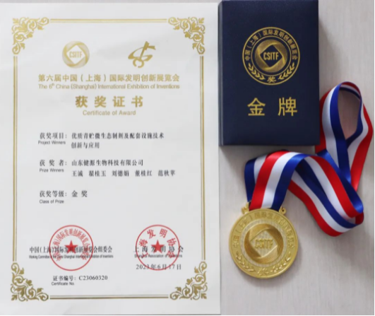 2023年6月17日,第六屆中國(上海)國際發明創新展覽會圓滿閉幕,頒獎典禮在上海世博館隆重舉行,山東健源生物科技有限公司《優質青貯微生態制劑及配套設施技術創新與應用》項目榮獲第六屆中國(上海)國際發明創新展覽會金獎。