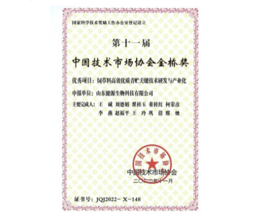 近日, “構建新發展格局,建設中國式現代化高層報告會暨第十一屆中國技術市場協會金橋獎表彰獎勵大會”在北京隆重召開,經專家評審委員會評審,山東健源生物科技有限公司《飼草料高效優質青貯關鍵技術研發與產業化》項目榮獲第十一屆中國技術市場協會金橋獎優秀項目獎。