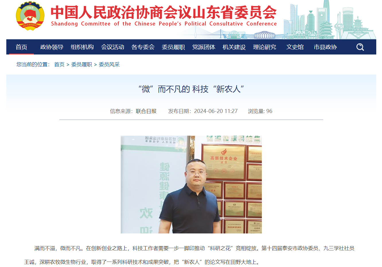 山東省政協(xié)官網(wǎng)對王誠董事長工作做報道