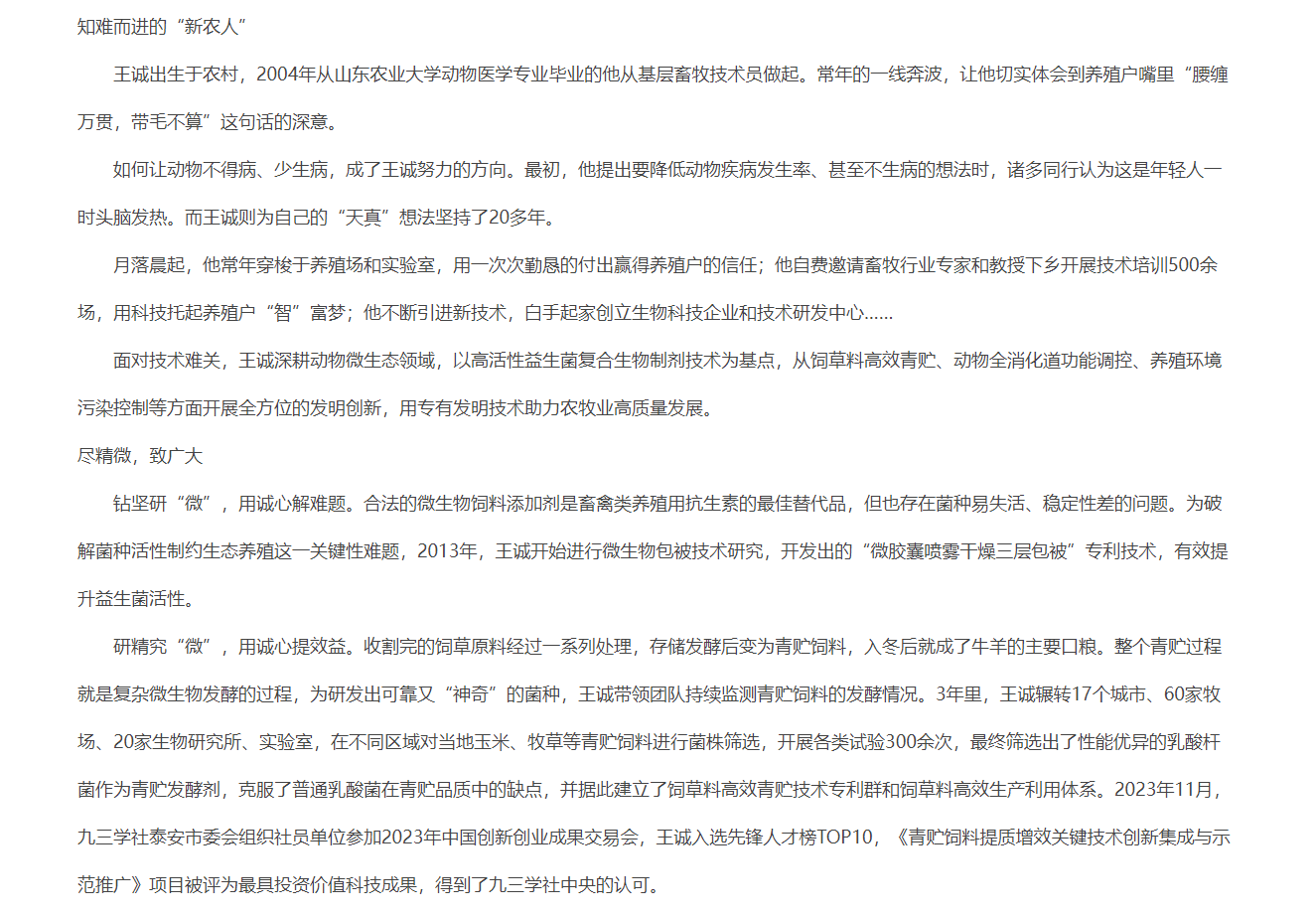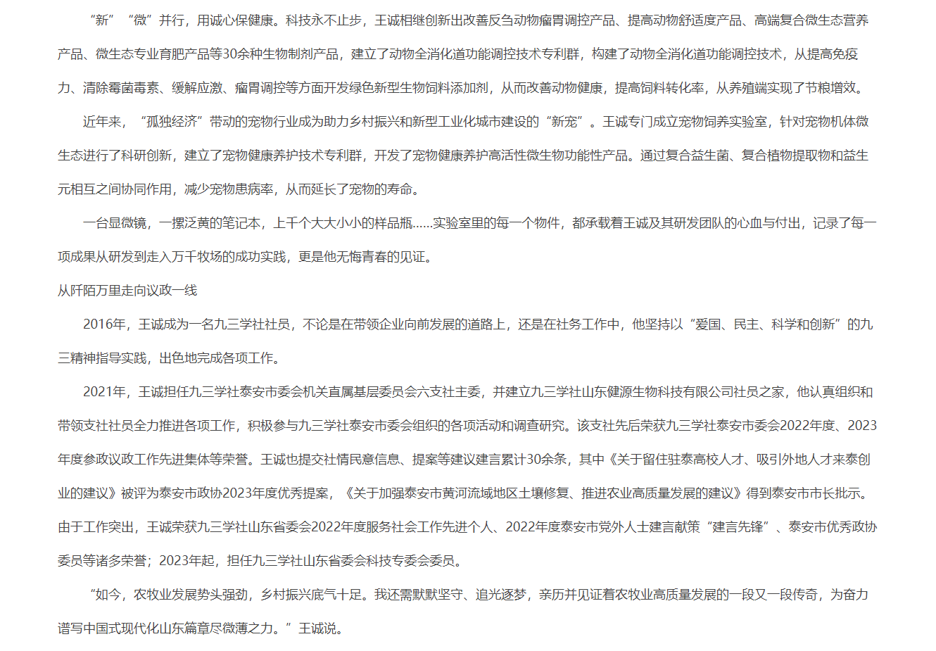 發(fā)布時間:[2024-8-7 15:16:1] 瀏覽量:3891次近日,中國人民政治協(xié)商會議山東省委員會官網(wǎng)推送《“微”而不凡的 科技“新農(nóng)人”》文章,報道山東健源生物科技有限公司董事長王誠作為“新農(nóng)人”,20多年來深耕微生態(tài)領域,以高活動性益生菌復合生物制劑技術為基點,從飼草料高效青貯、動物全消化道功能調(diào)控、養(yǎng)殖環(huán)境污染控制等方面全方位的發(fā)明創(chuàng)新,用專有發(fā)明技術助力農(nóng)牧業(yè)高質(zhì)量發(fā)展。而作為一名九三學社社員,王誠董事長堅持以“愛國、民主、科學和創(chuàng)新”的九三精神指導實踐,出色地完成各項工作。全文如下: