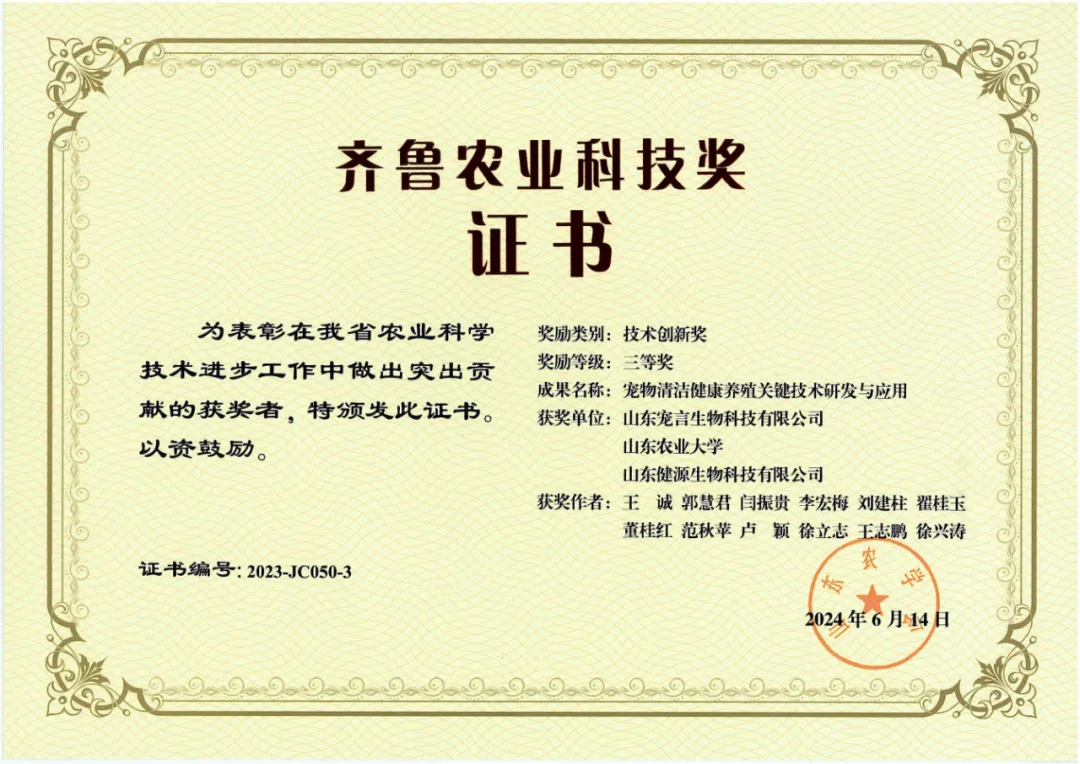 8月30日,第四屆齊魯農業科技獎獎勵大會暨第二屆青年學術論壇在濟南召開,評選出77項2023年度齊魯農業科技獎。山東健源生物科技有限公司與子公司山東寵言生物科技有限公司共同完成的“寵物清潔健康養殖關鍵技術研發與應用”項目榮獲2023年度齊魯農業科技獎技術創新獎三等獎。