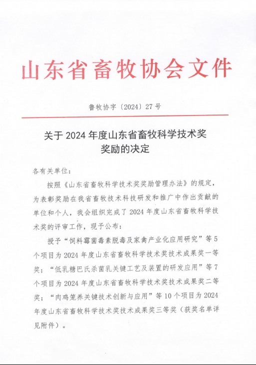 近日,山東省畜牧協會公布了2024年山東省畜牧科學技術獎獲獎名單。山東健源生物科技有限公司與子公司山東寵言生物科技有限公司共同完成的“寵物清潔健康養殖關鍵技術研發與應用”項目,憑借其創新性與實用性,榮獲山東省畜牧科學技術獎科學技術成果獎一等獎。