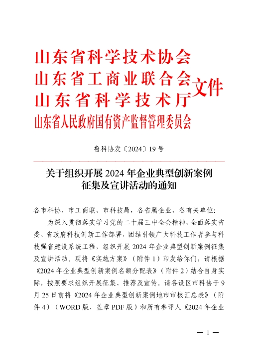 2024年企業典型性創新案例征集及宣講活動,是根據中國科協要求,按照《關于組織開展2024年企業典型創新案例征集及宣講活動的通知》(魯科協發〔2024〕19號)有關規定,依托園區(企業)科協組織,對在科學研究、技術應用、科技推廣、技術創新、成果轉化等工作中取得優異成績、具有示范意義的典型案例進行推薦,通過講述創新故事,弘揚企業家精神、科學家精神、工匠精神,激發創新活力。